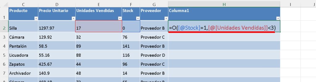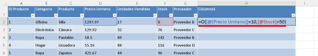=O([@[Precio Unitario]]<10,[@Stock]>50)