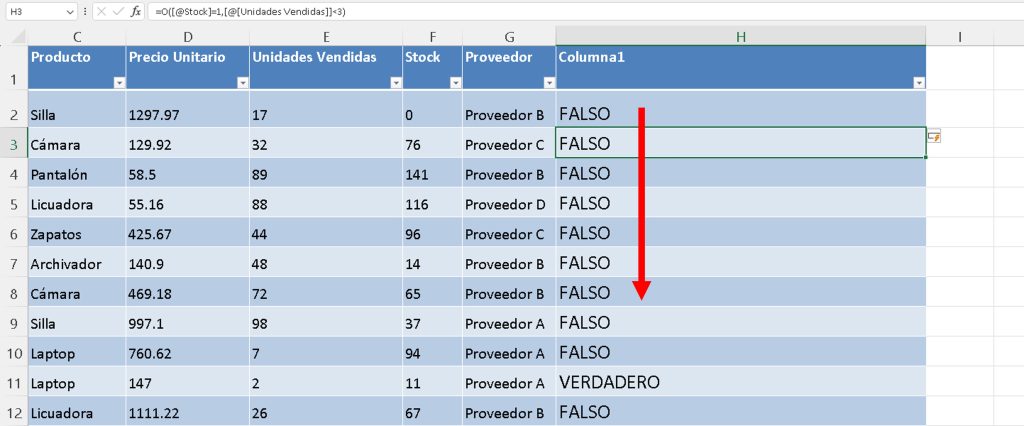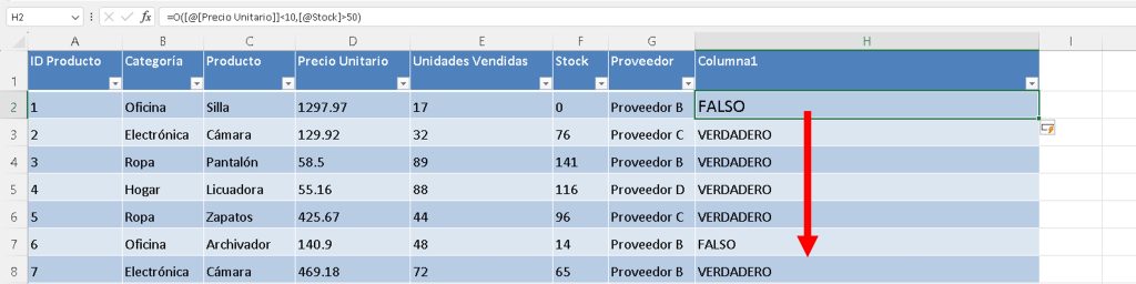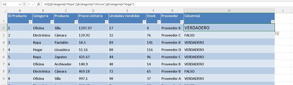 - Resultado: VERDADERO si la categoría es una de las tres; FALSO si no (por ejemplo, «Electrónica»).