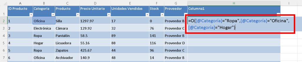 =O([@Categoría]="Ropa",[@Categoría]="Oficina",[@Categoría]="Hogar")