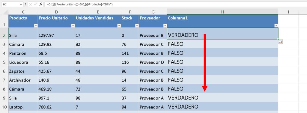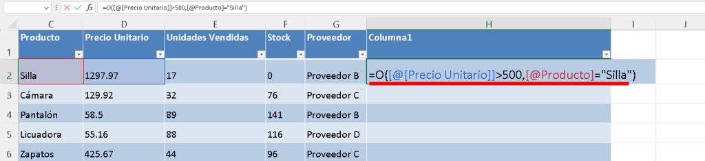 =O([@[Precio Unitario]]>500,[@Producto]="Silla")