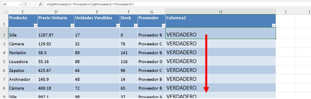 - Resultado: VERDADERO si el proveedor no es A ni B; FALSO si es A o B (rara vez FALSO, ya que basta una condición).