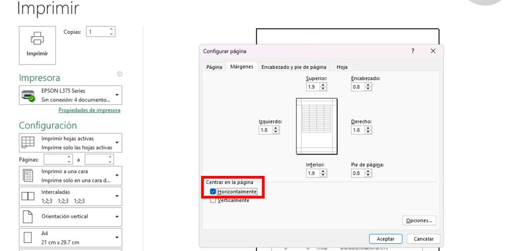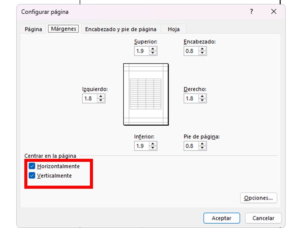 Excel incluye una opción que permite centrar automáticamente la tabla dentro de la hoja de impresión. Con esta configuración podrás alinear el contenido horizontalmente, verticalmente o en ambas direcciones para lograr un resultado más limpio y profesional.