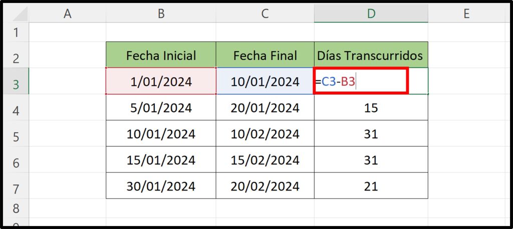 - Donde C3 es la fecha final y B3 es la fecha inicial.