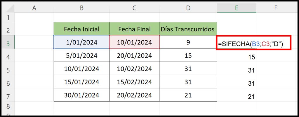 Para calcular los Días transcurridos, usaremos la función SIFECHA de Excel.
