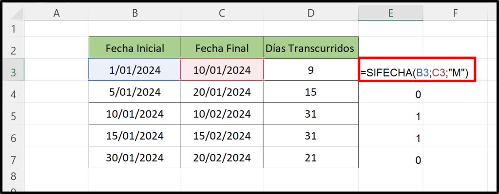 Para calcular los meses transcurridos, usaremos la función SIFECHA de Excel.