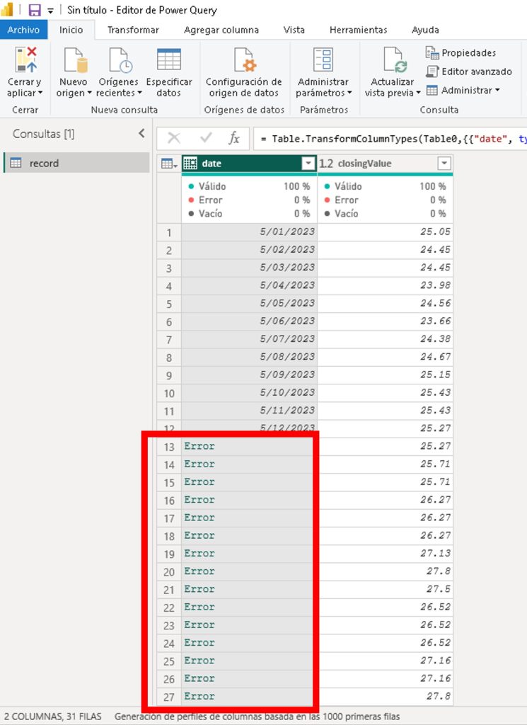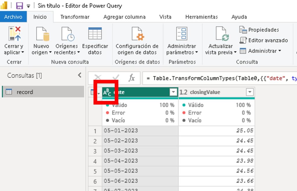 - Si ves que los datos no tienen sentido o aparecen con el tipo de dato Texto (ABC), significa que Power Query no los está interpretando correctamente.