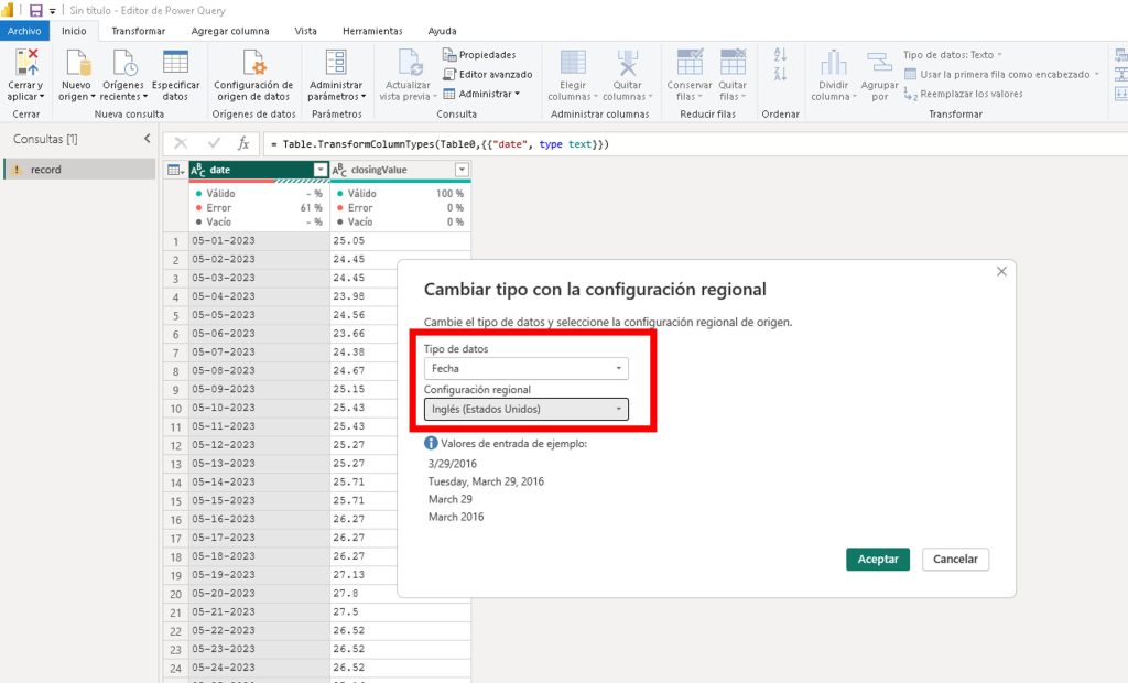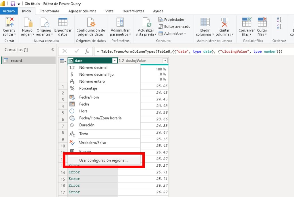Si no ajustamos la configuración regional, al intentar convertir una columna de fecha o números, podrías obtener errores o valores incorrectos.