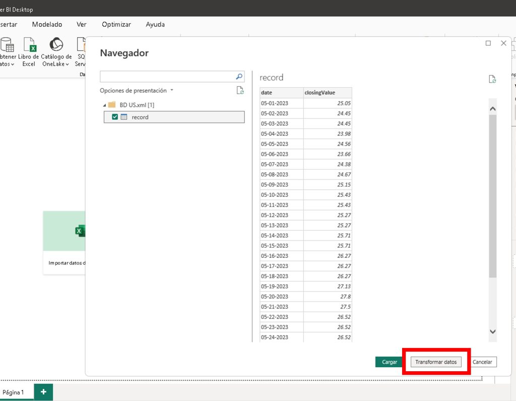 - Selecciona la tabla que deseas importar y haz clic en Transformar Datos.
