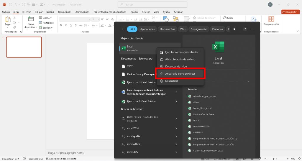 - Haz clic derecho en el ícono de Excel > Anclar a la barra de tareas.