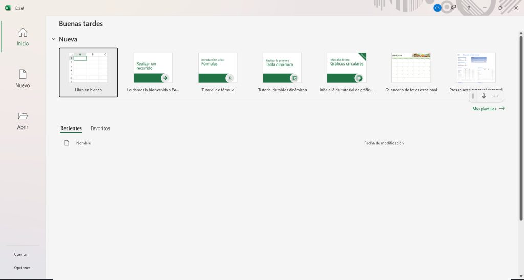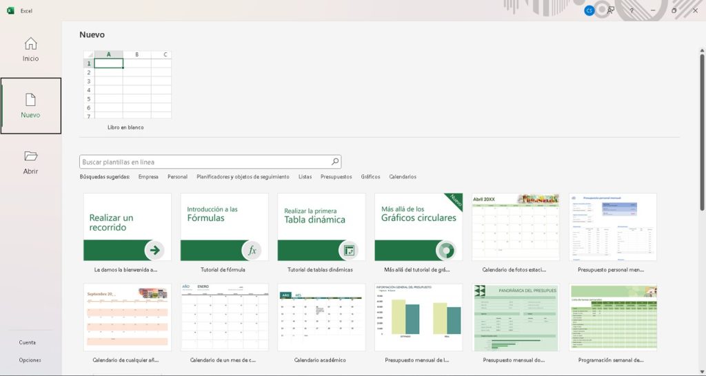 - Al abrir Excel, aparece la pantalla de inicio con varias opciones a la izquierda: Inicio, Nuevo, Abrir, Cuenta, Comentarios, Opciones.