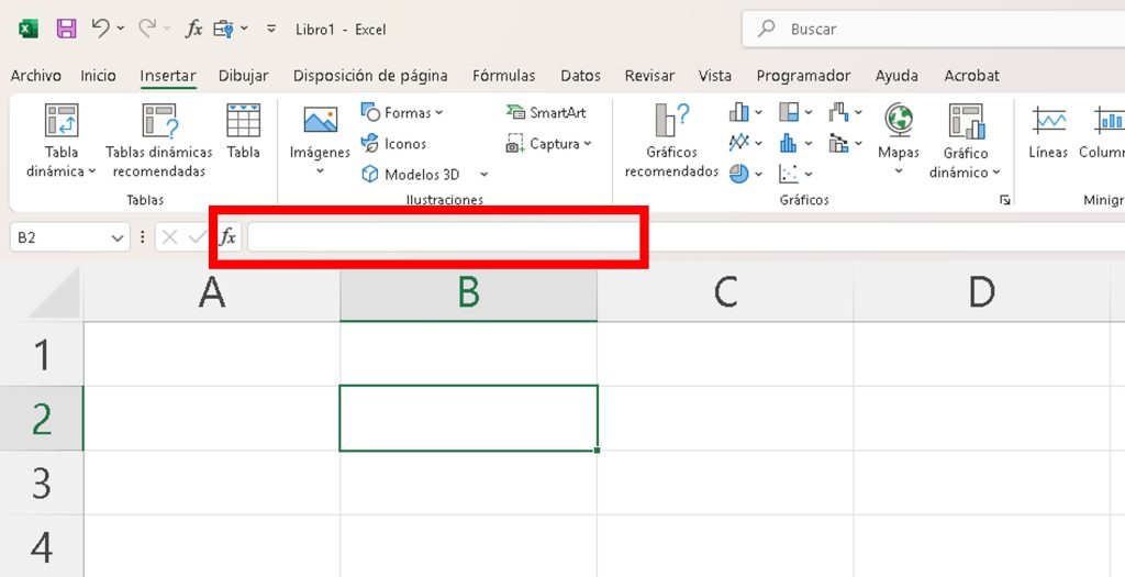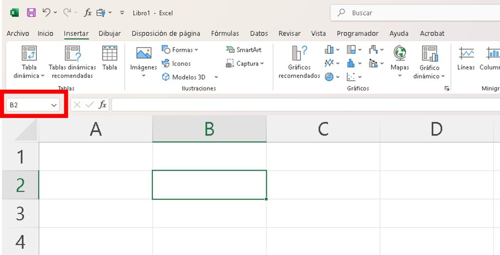 - Muestra la referencia de la celda seleccionada (por ejemplo, B2).