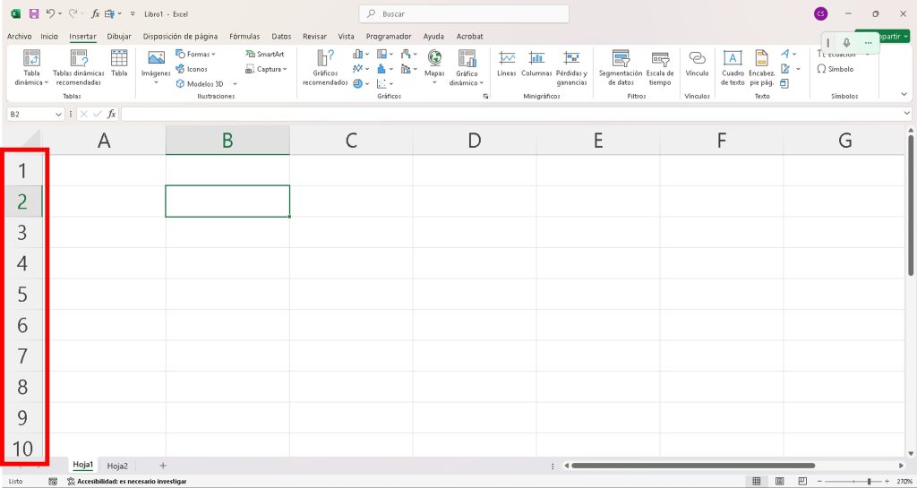 - Columnas: A la izquierda, identificadas por números (1, 2, 3, …, 1048576).