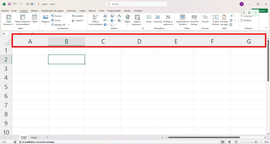 - Filas: En la parte superior, identificadas por letras (A, B, C, …, XFD).