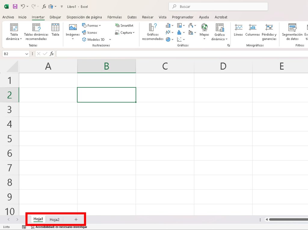 - Cada libro contiene hojas (por defecto, Hoja1).