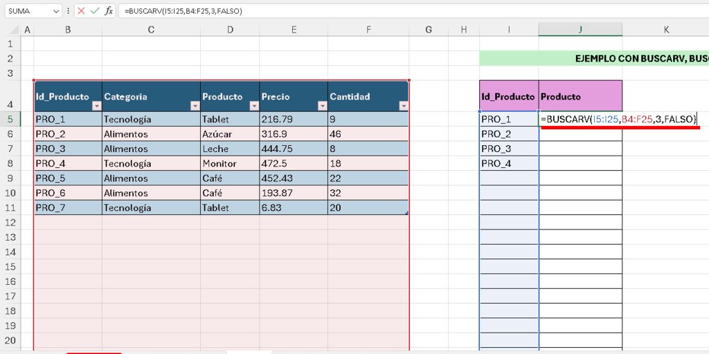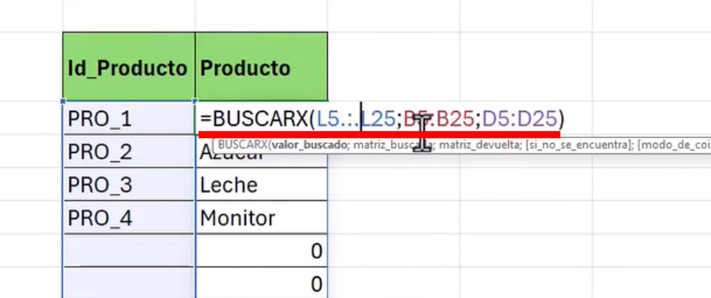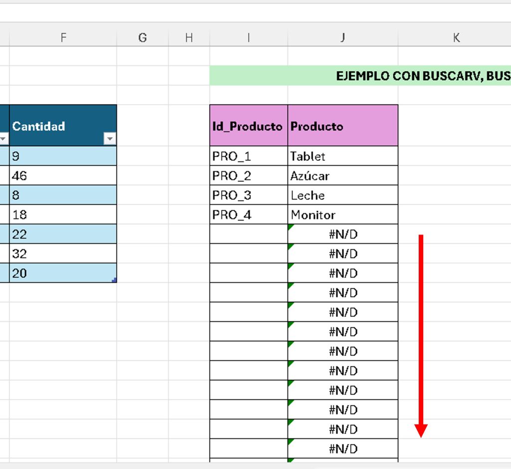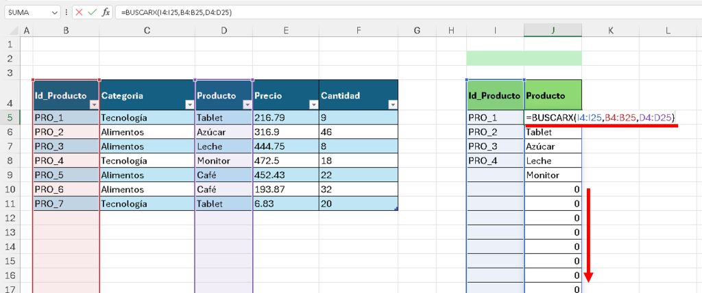 - Problema: =BUSCARX(I4:I25,B4:B25,D4:D25)→ Error 0 por vacíos en «Producto».