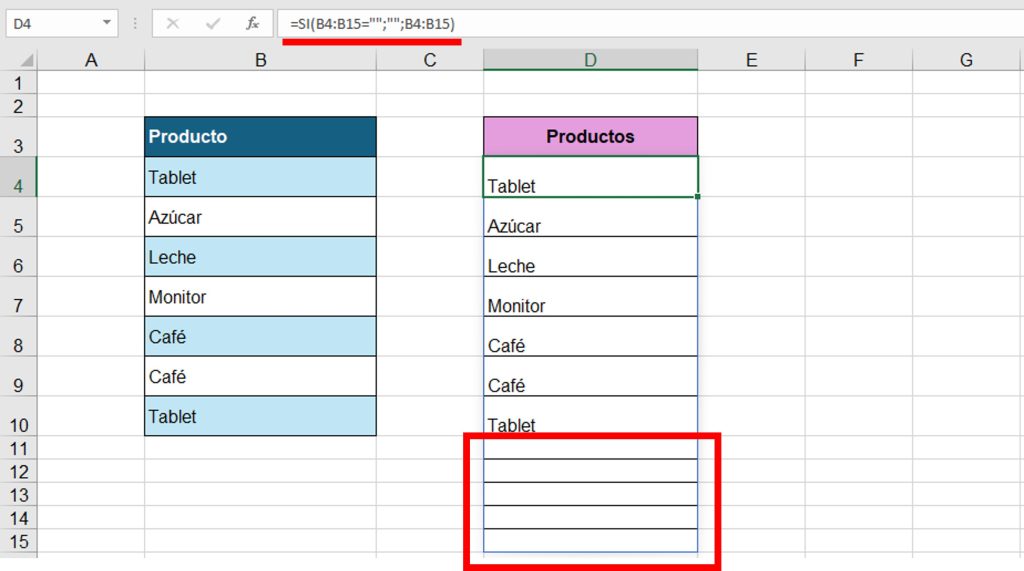 - Con SI: =SI(B4:B15=»»;»»;B4:B15) → Elimina vacíos manualmente.