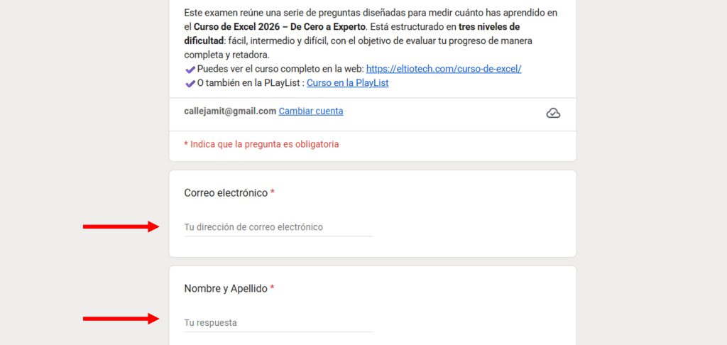 En el cuestionario te pedirán algunos datos básicos como tu nombre y correo electrónico antes de comenzar.