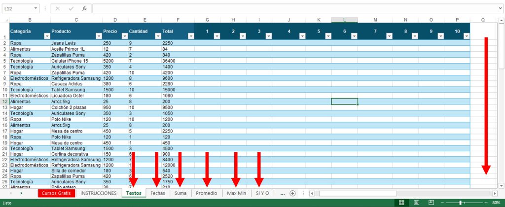 Las preguntas o ejercicios se encuentran a un lado de la tabla, mientras que el espacio para resolverlos aparece en las columnas principales. Allí deberás aplicar las fórmulas o funciones correspondientes para obtener el resultado.