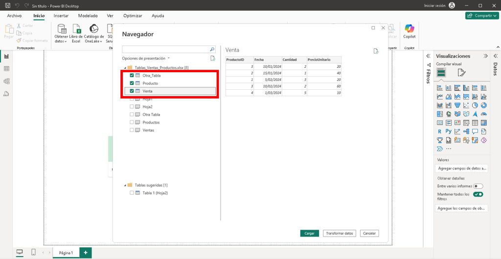 - Carga las tablas: Ventas, Productos, y OtraTabla (independiente).