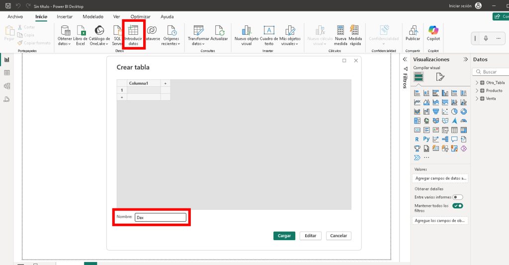 - Ve a Inicio > Introducir Datos, crea una tabla llamada DAX y cárgala.