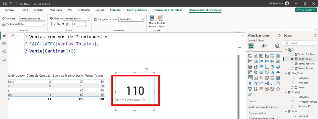 VentasMas2Unidades = CALCULATE([VentasTotales], Ventas[Cantidad] > 2)