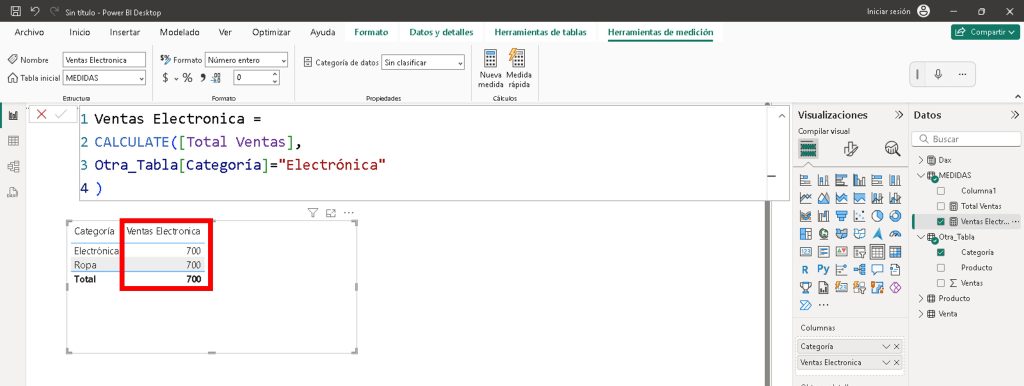 - Por qué: CALCULATE fuerza el filtro Electrónica, ignorando el contexto de la tabla (categoría Ropa). Esto es un comportamiento típico. 🚨