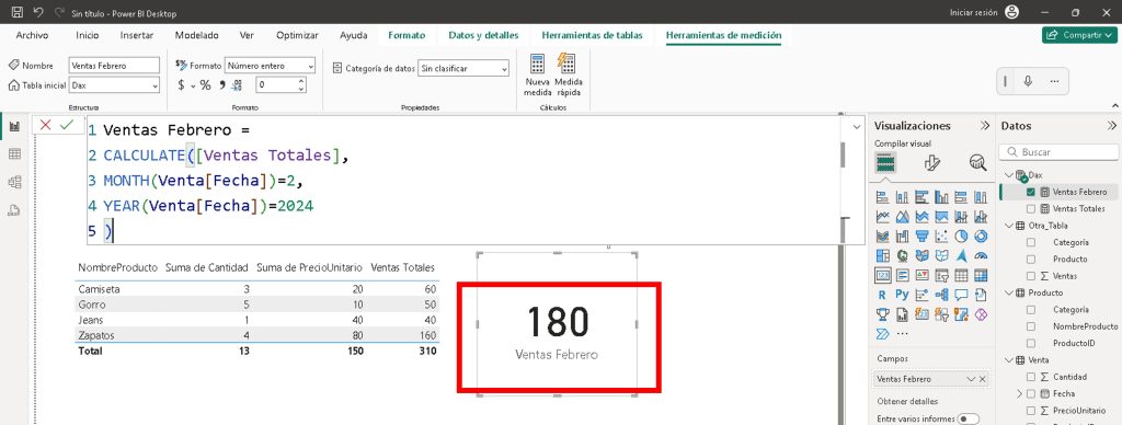 - MONTH(Ventas[Fecha]) = 2: Filtra febrero.