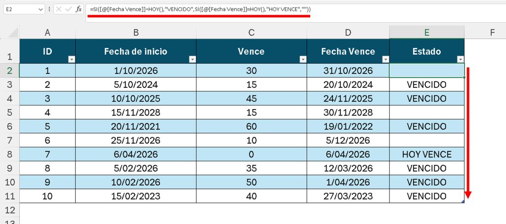 =SI([@[Fecha Vence]]<HOY(),"VENCIDO",SI([@[Fecha Vence]]=HOY(),"HOY VENCE",""))