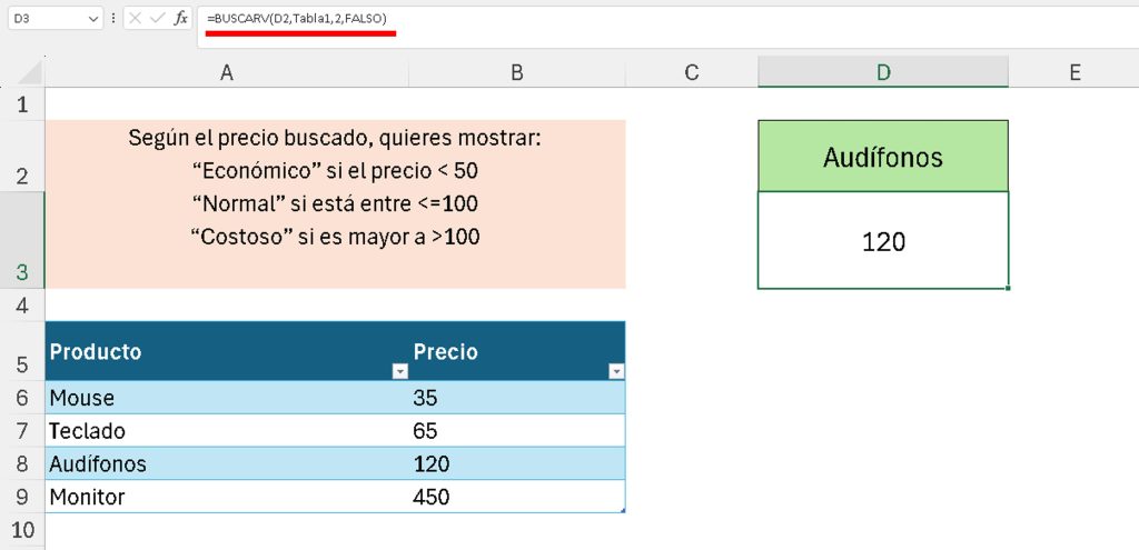 =SI(BUSCARV(D2,Tabla1,2,FALSO)<50,"Económico",