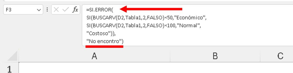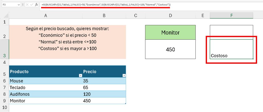 =SI(BUSCARV(A2,tabla,2,FALSO)<50,"Económico", =SI(BUSCARV(D2,Tabla1,2,FALSO)<50,"Económico",SI(BUSCARV(D2,Tabla1,2,FALSO)<100,"Normal","Costoso")) "Costoso"))
