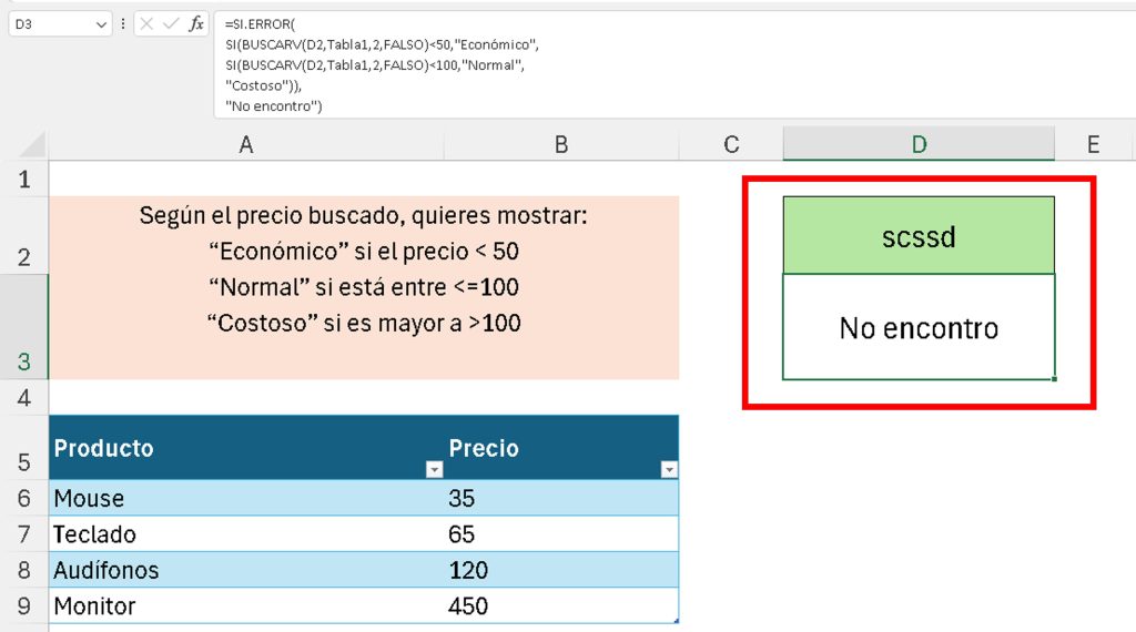 En lugar de usar el precio directamente, se integra la función BUSCARV dentro del SI.