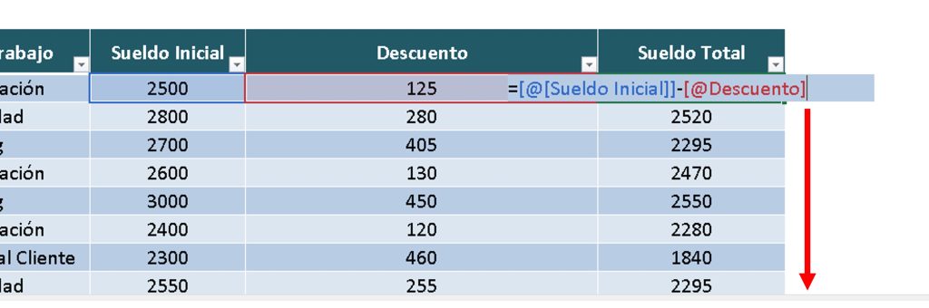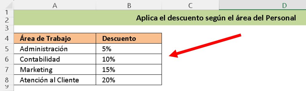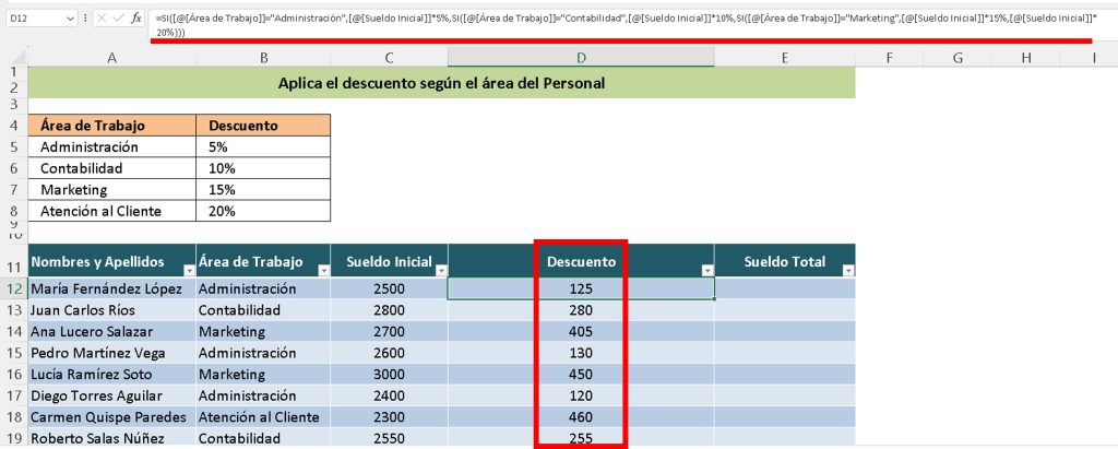 =SI([@[Área de Trabajo]]="Administración",[@[Sueldo Inicial]]5%,SI([@[Área de Trabajo]]="Contabilidad",[@[Sueldo Inicial]]10%,SI([@[Área de Trabajo]]="Marketing",[@[Sueldo Inicial]]15%,[@[Sueldo Inicial]]20%)))