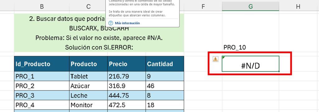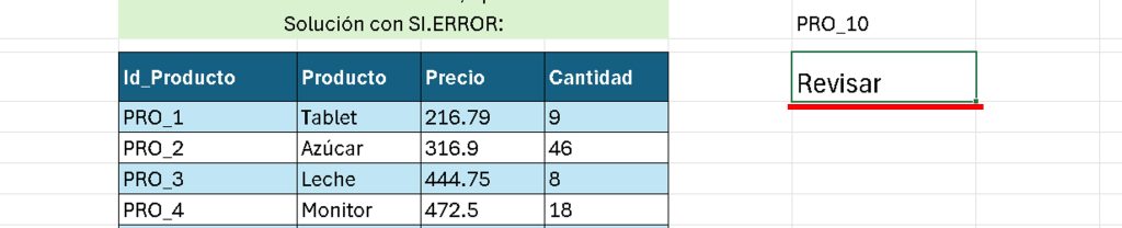 - Valor_si_error: Texto (por ejemplo, «Revisar»), número (0), o vacío («») que aparece si hay error.