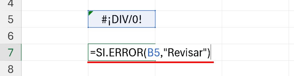 =SI.ERROR(B5;"Revisar")- Si hay error, muestra «Revisar».