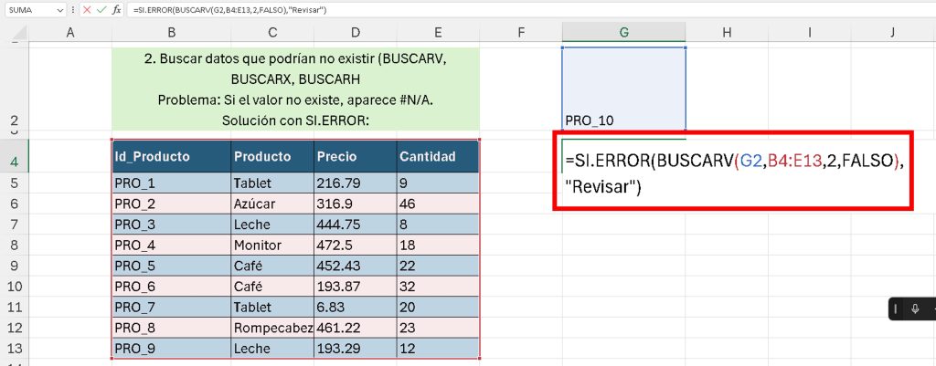 - Solución: =SI.ERROR(BUSCARV(G2,B4:E13,2,FALSO),»Revisar»)