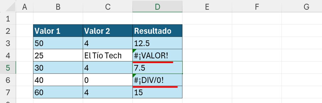 - Problema: Dividir un número por texto (=50/»Texto») o cero (=50/0) genera #VALOR! o #DIV/0!.