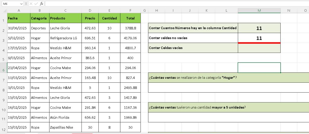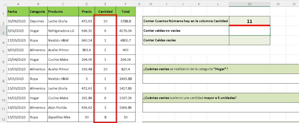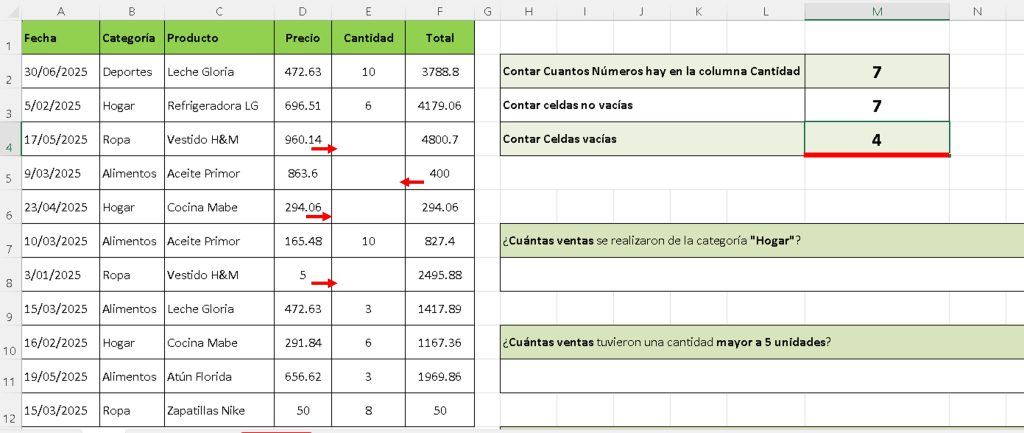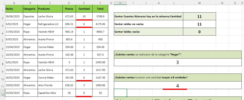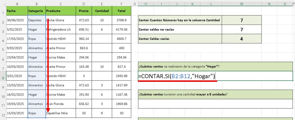 - Resultado: Devuelve el número de celdas con «Hogar» (por ejemplo, 3).