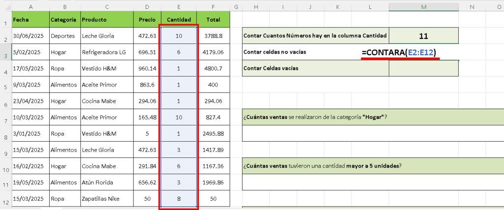Ejemplo: =CONTARA(E2:E12) → Presiona Enter.