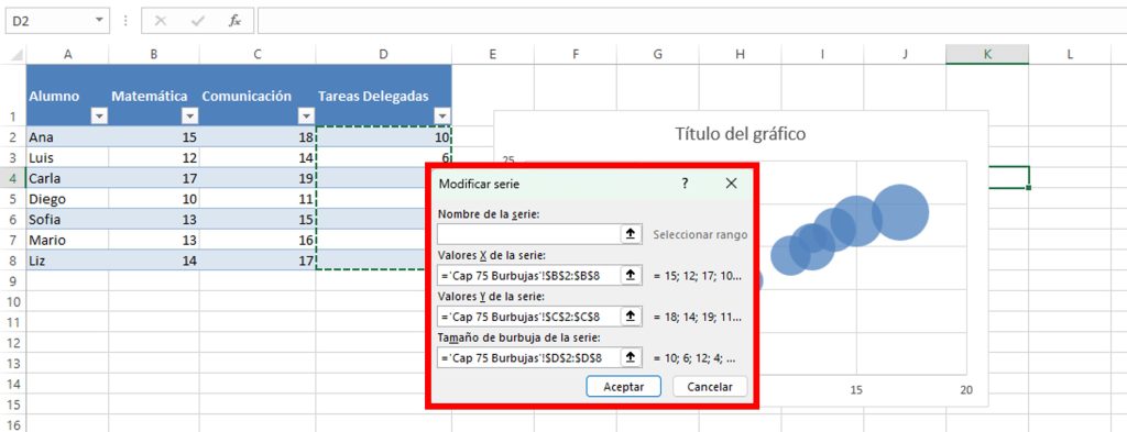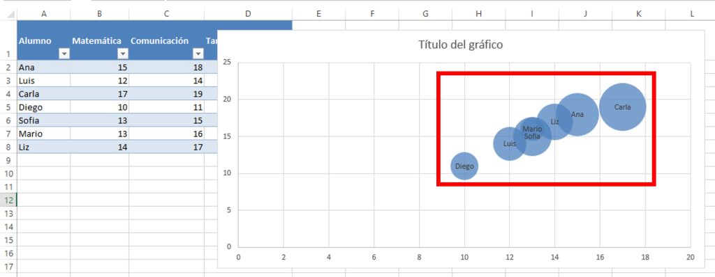 Al aceptar, Excel mostrará las burbujas dentro del gráfico.