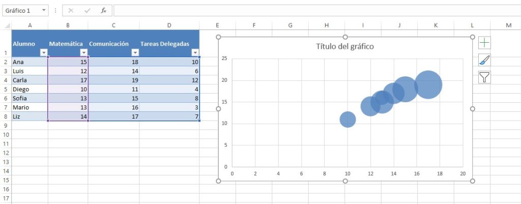 - En Tamaño de burbuja selecciona la tercera variable (por ejemplo tareas entregadas).