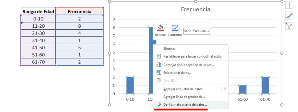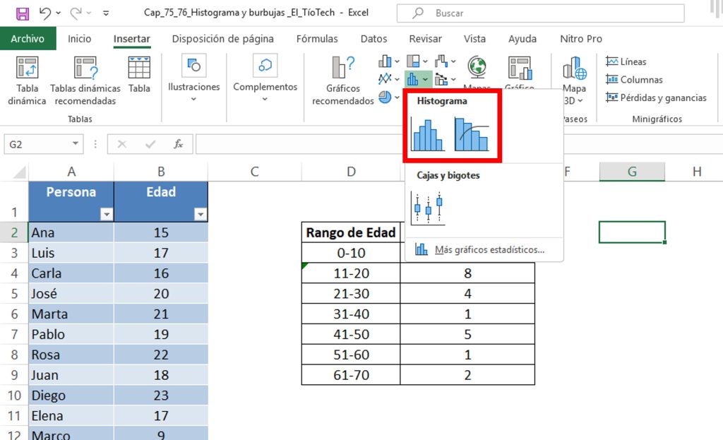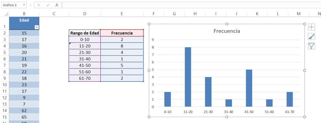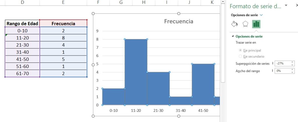 Excel generará el gráfico agrupando los datos en intervalos automáticamente.