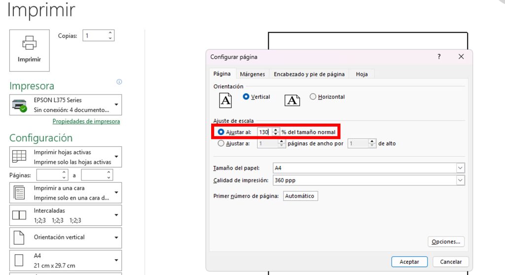 En la pestaña Página encontrarás la opción Escala, que normalmente está configurada en 100%.