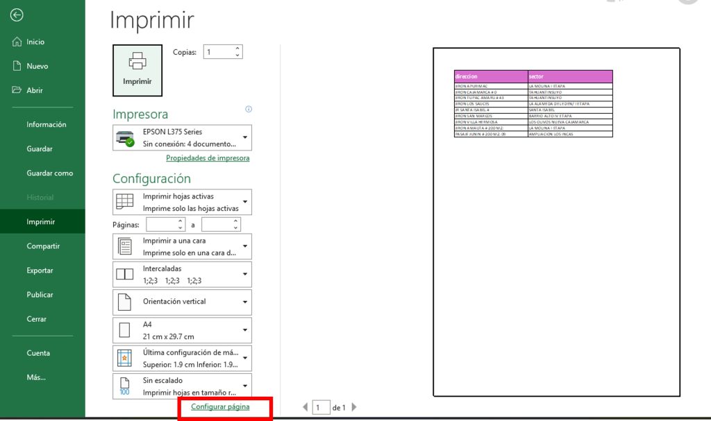 Dentro de la ventana de impresión, haz clic en Configurar página.