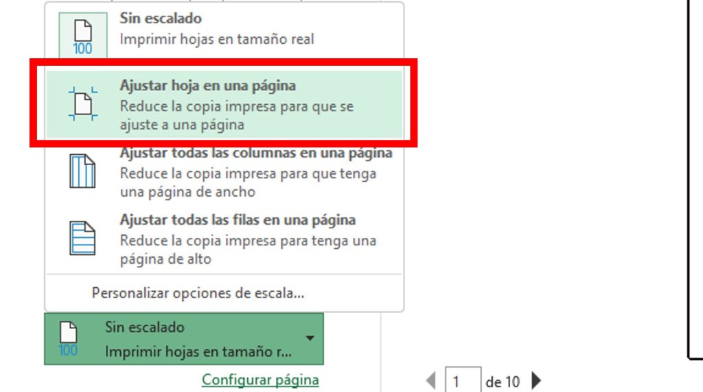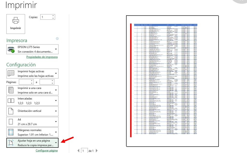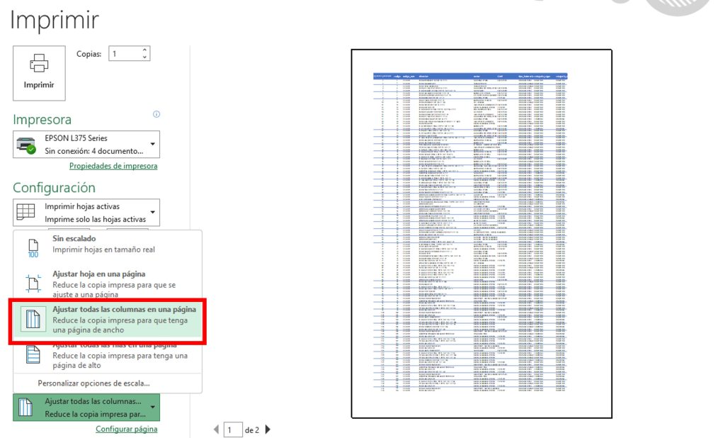 La opción Ajustar hoja en una página es una de las formas más rápidas de imprimir tablas grandes sin perder información.