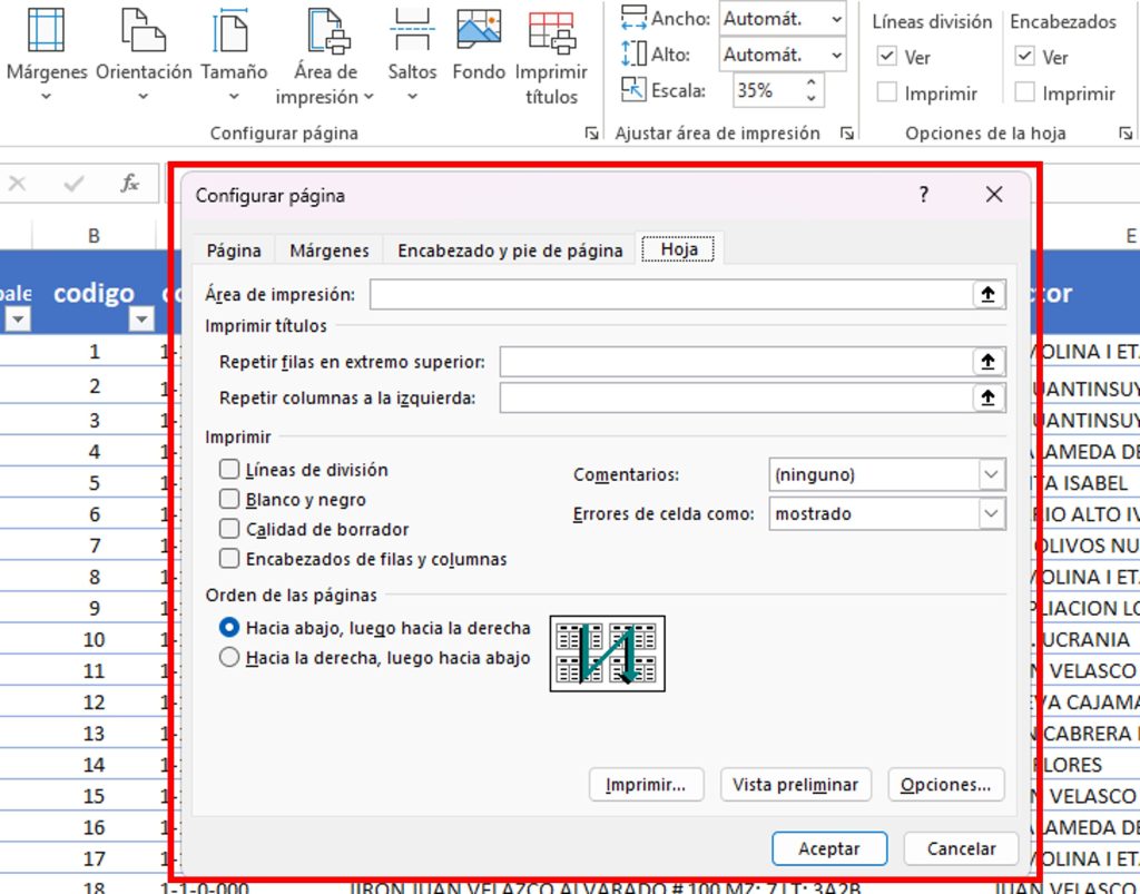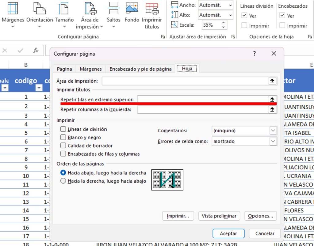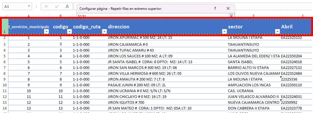 Al hacer clic se abrirá una ventana de configuración para definir qué filas o columnas deben repetirse al imprimir.