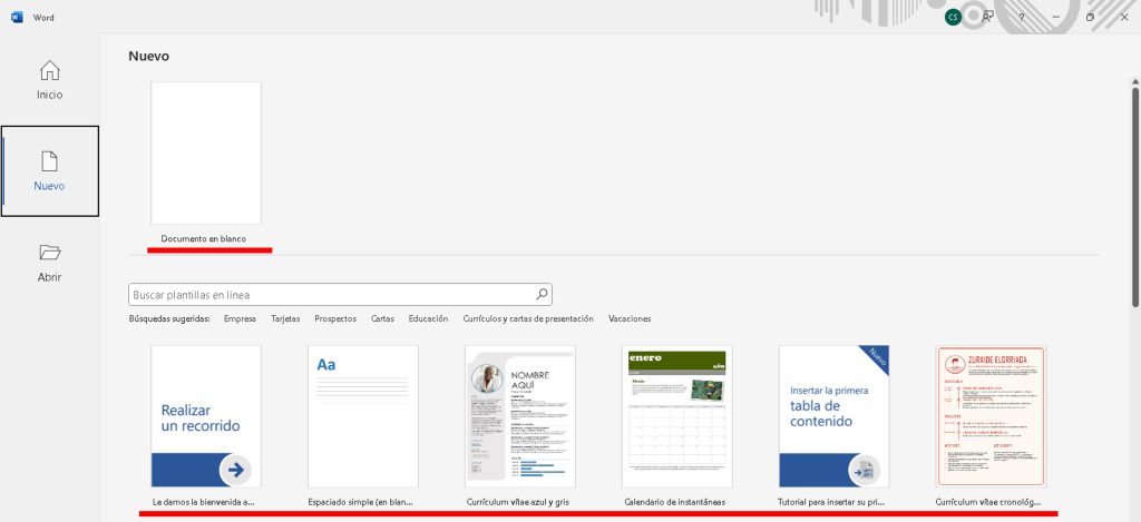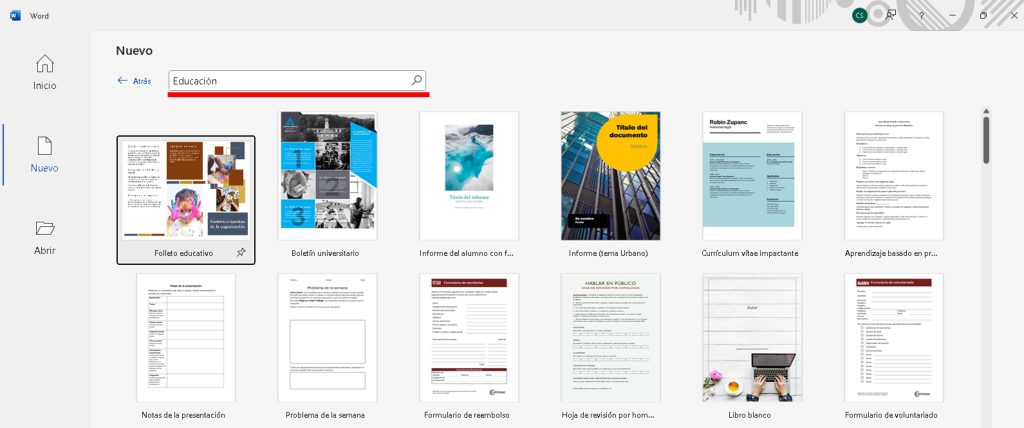 - Barra de búsqueda para plantillas en línea.