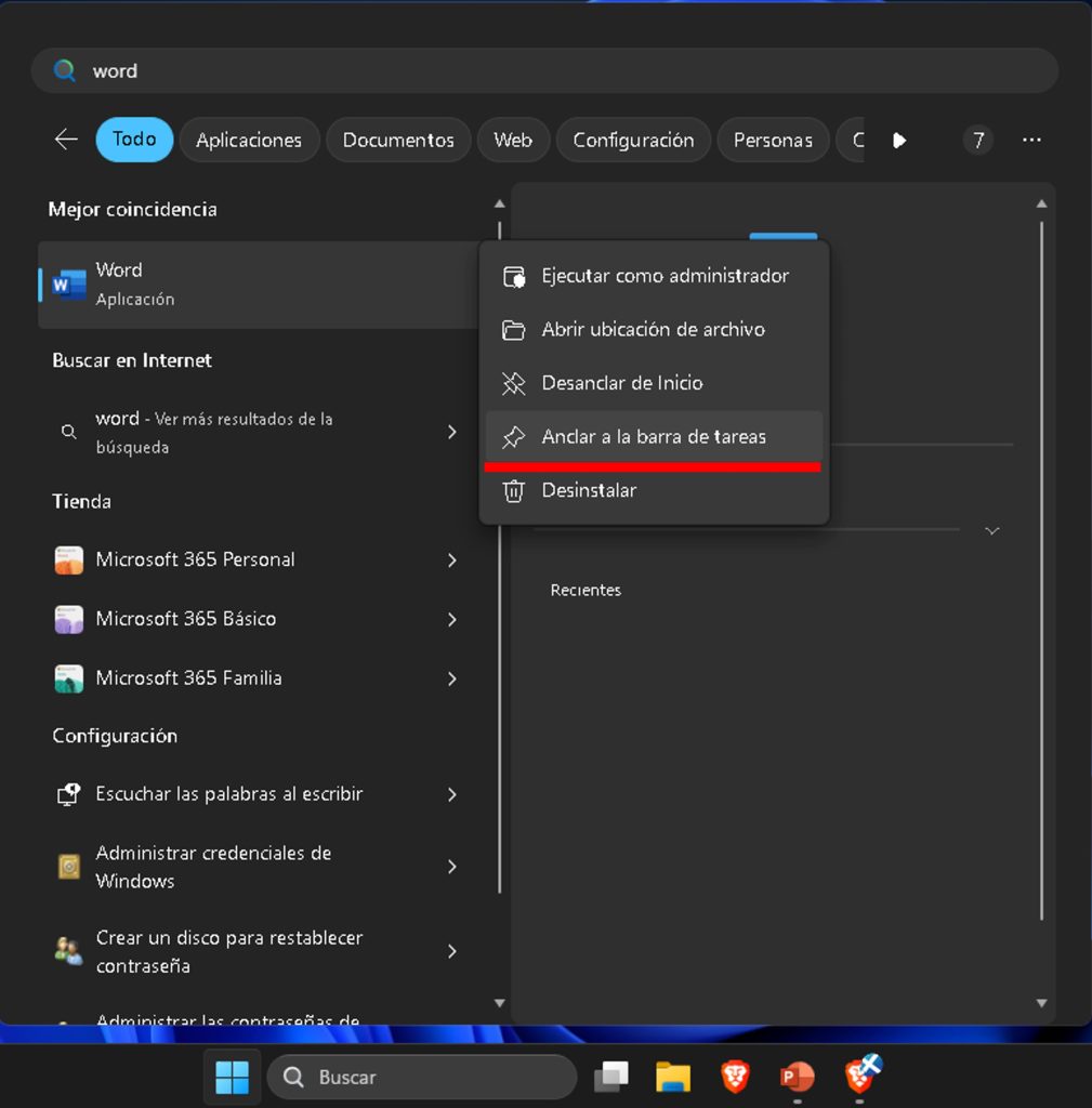 - Para anclarlo: Busca «Word» en la barra de búsqueda > Clic derecho > Anclar a la barra de tareas.