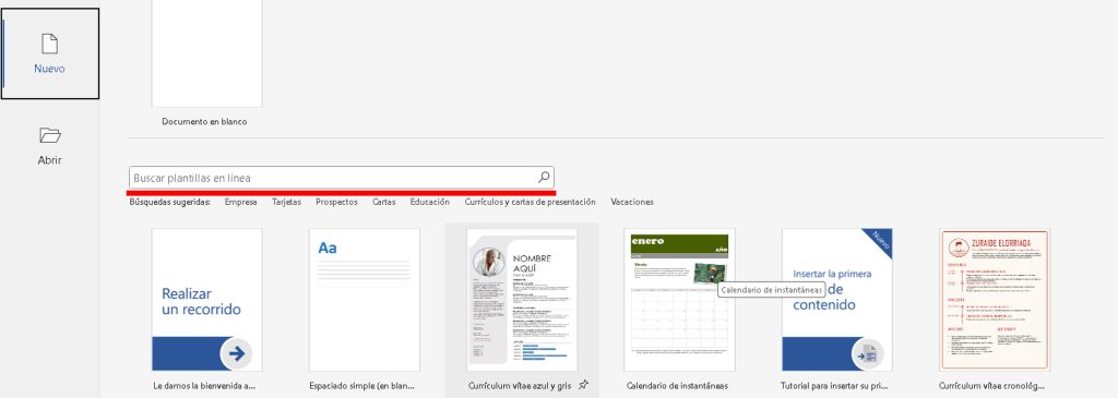 - Búsquedas sugeridas: Empresa, cartas, calendarios, etc.