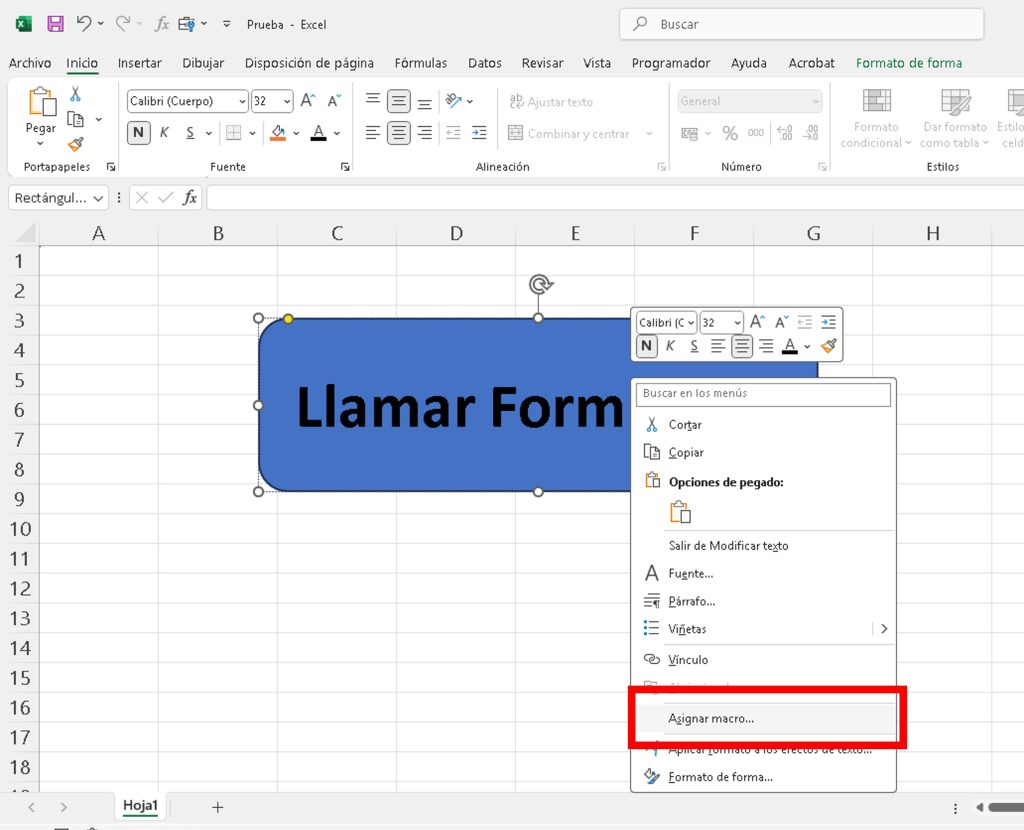 - Haz clic derecho en la forma > Asignar Macro.
