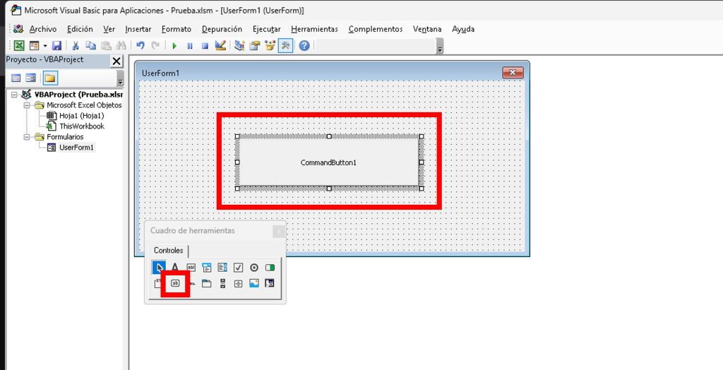 - En la barra de herramientas del diseñador, selecciona CommandButton y arrástralo al formulario.